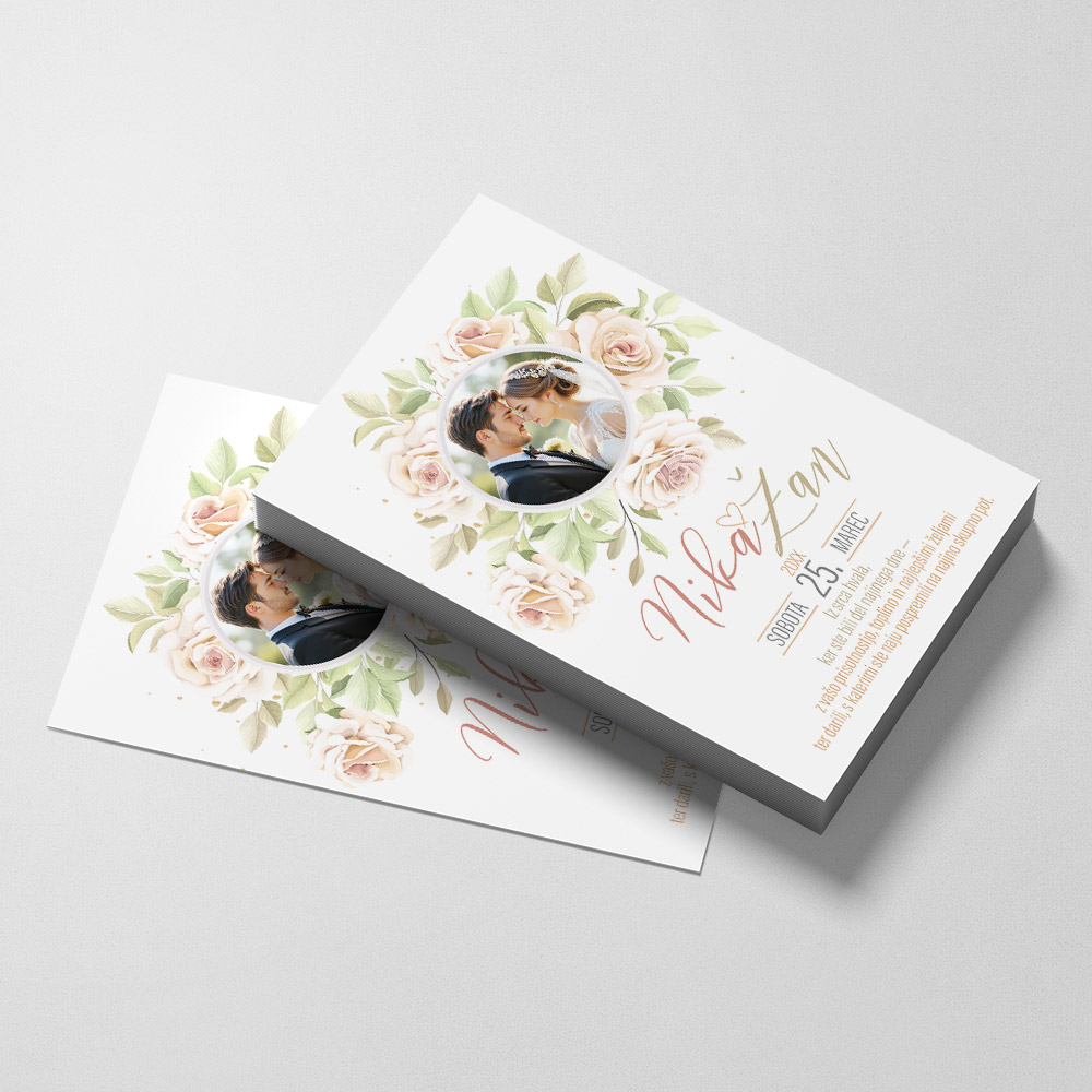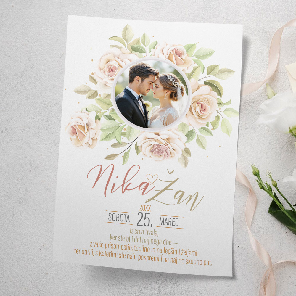 Ta poročna zahvala s fotografijo mladoporočencev je čudovit in oseben spomin na vajin najlepši dan. Elegantna postavitev s prostorom za vajino skupno sliko izraža hvaležnost na topel in iskren način. Popolna izbira za vse, ki želita svojo zahvalo podariti s srčnostjo in pridihom elegance.