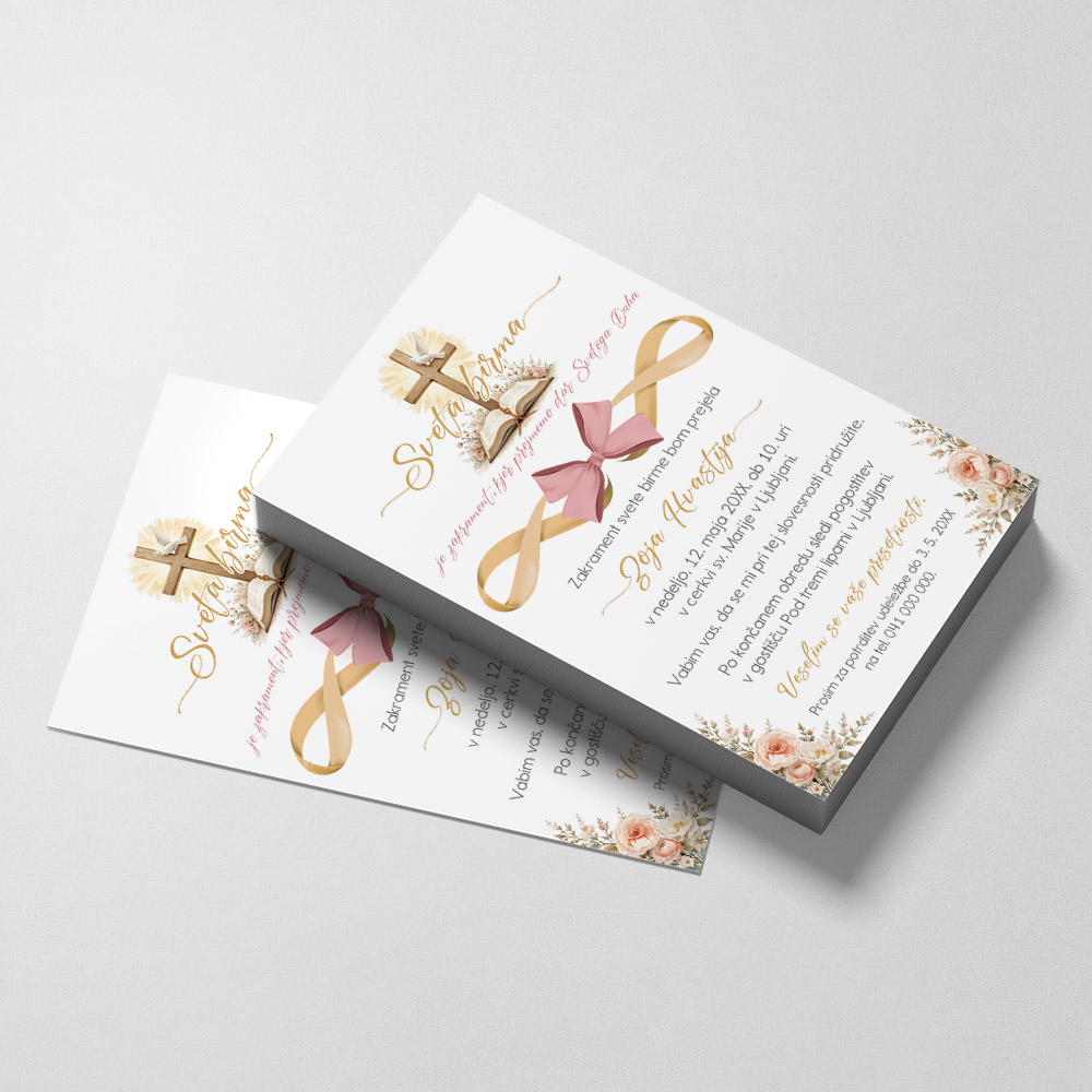 Vabilo za birmo deklice z rožnatim trakom in zlatimi poudarki izraža nežnost, milino in toplino posebnega trenutka. Cvetlični detajli simbolizirajo rast, čistost in duhovno lepoto, medtem ko elegantna zasnova ustvarja občutek prazničnosti in spoštovanja.