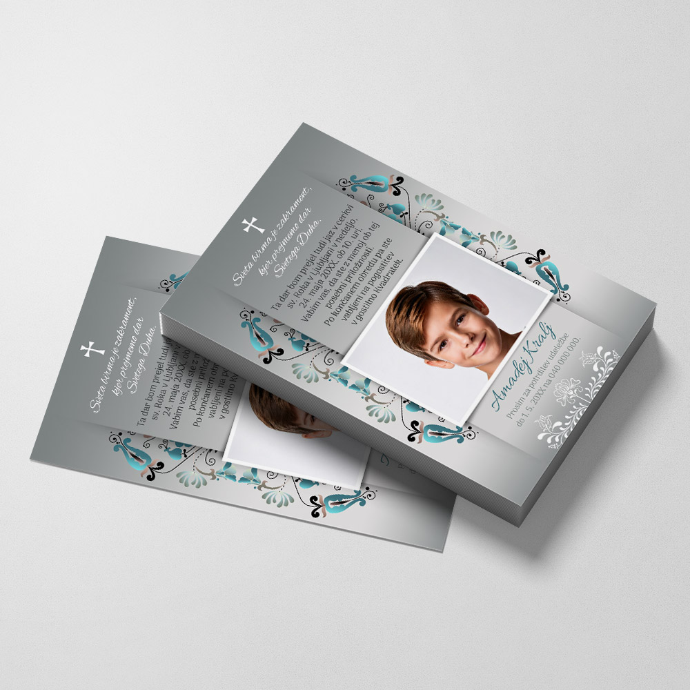 Elegantno vabilo na obhajilo, ki z nežnimi vzorci in srebrnimi odtenki izraža globok duhovni pomen tega pomembnega trenutka. Primerno je za vse, ki želijo svojim bližnjim na poseben način sporočiti povabilo k temeljni življenjski prelomnici otroka. Možnost prilagoditve besedila omogoča, da vabilo popolnoma ustreza vašim željam.