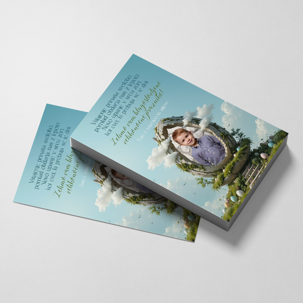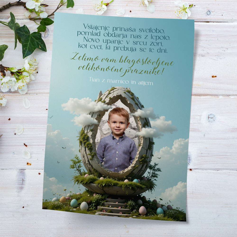Velikonočna voščilnica s fantazijskim zmajevim jajcem prinaša igrivo kombinacijo prazničnega vzdušja in domišljijskega sveta zmajev. Na jajcu je prostor za fotografijo malega navdušenca nad zmaji, kar voščilnici doda osebno noto in edinstven čar. Zabavna in malce drugačna izbira za vse, ki iščejo nekaj posebnega za velikonočna voščila.